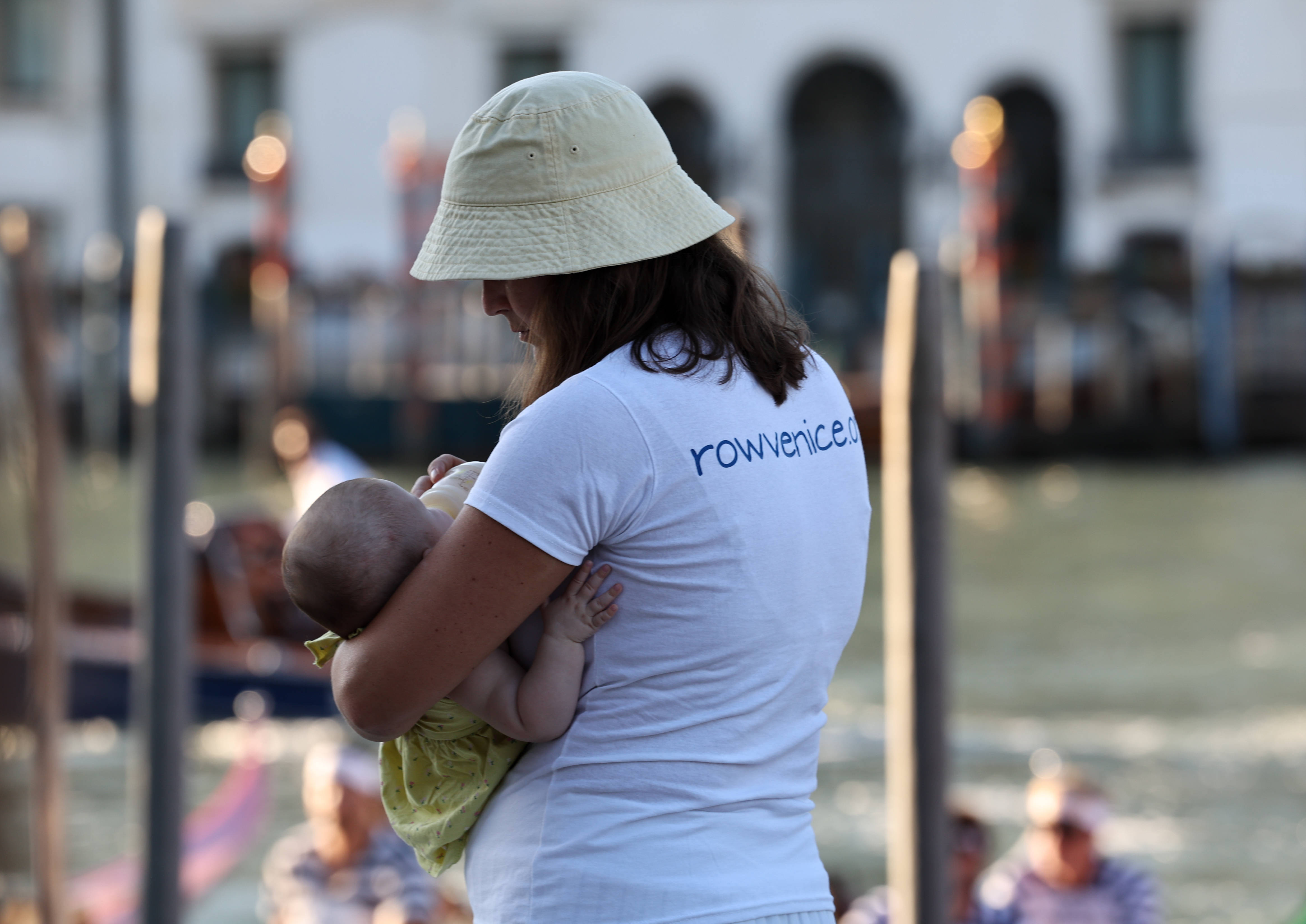 9月4日,在意大利威尼斯,“划行威尼斯”成员朱莉娅·塔利亚彼得拉在传统赛船节彩排仪式间隙给孩子喂奶。她的第二个孩子刚刚出生3个月。 新华社记者 李京 摄